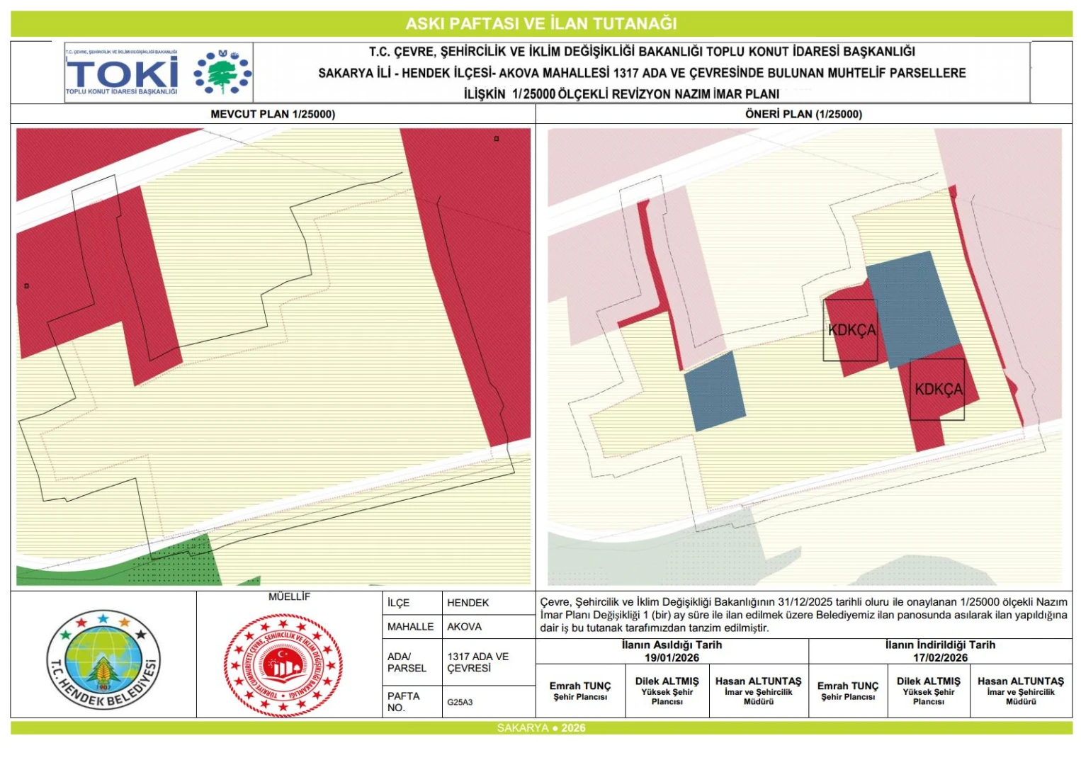 Çevre, Şehircilik ve İklim Değişikliği Bakanlığının 31/12/2025 tarihli oluru ile onaylanan Akova Mahallesi 1317 ada ve çevresi ile ilgili hazırlanmış olan 1/1000 ölçekli Uygulama İmar Planı Değişikliği,