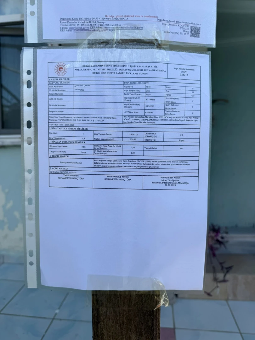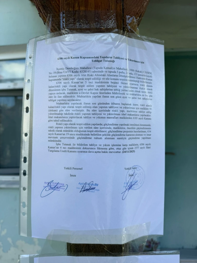 Bu sebeple; söz konusu riskli yapıya ilişkin tebligat, tutanak ve fotoğraflar