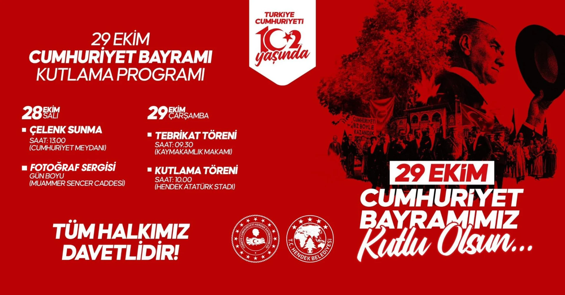 Hendek Kaymakamlığımız öncülüğünde hazırlanan 29 Ekim Cumhuriyet Bayramı kutlama etkinliklerine tüm halkımız davetlidir.