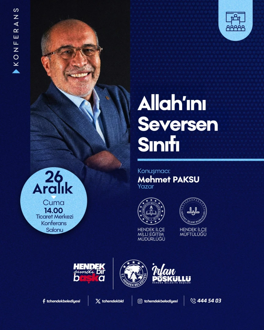 Hendek Belediyesi ev sahipliğinde; Hendek İlçe Milli Eğitim Müdürlüğü ve Hendek İlçe Müftülüğü iş birliğiyle düzenlenen konferanslara tüm vatandaşlarımız davetlidir.