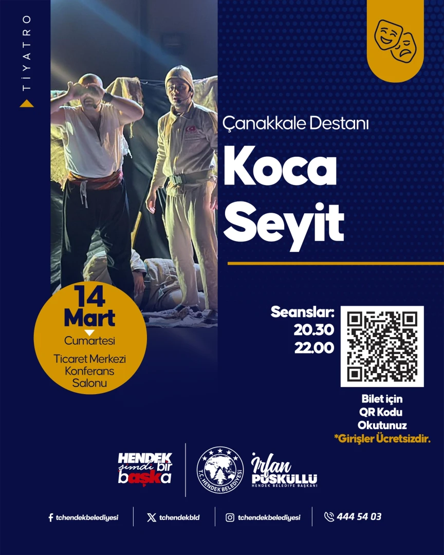 Hendek Belediyesi olarak 14 Mart 2026 Cumartesi günü Çanakkale Zaferini konu alan bir tiyatro ile sizlerle buluşuyor.