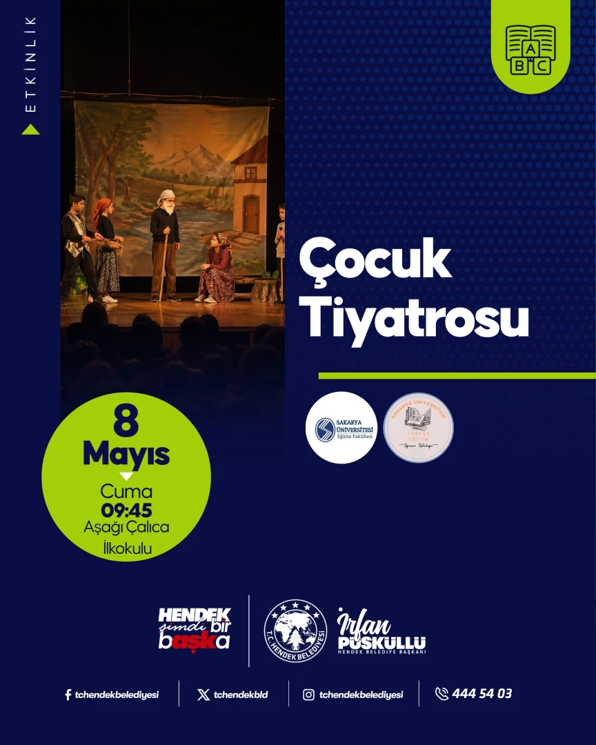 Hendek Belediyesi ile Sakarya Üniversitesi Eğitim Fakültesi Türkçe Eğitim Topluluğu tiyatro ekibi tarafından Aşağı Çalıca İlkokulu öğrencilerine yönelik tiyatro etkinliği ile buluşuyoruz.