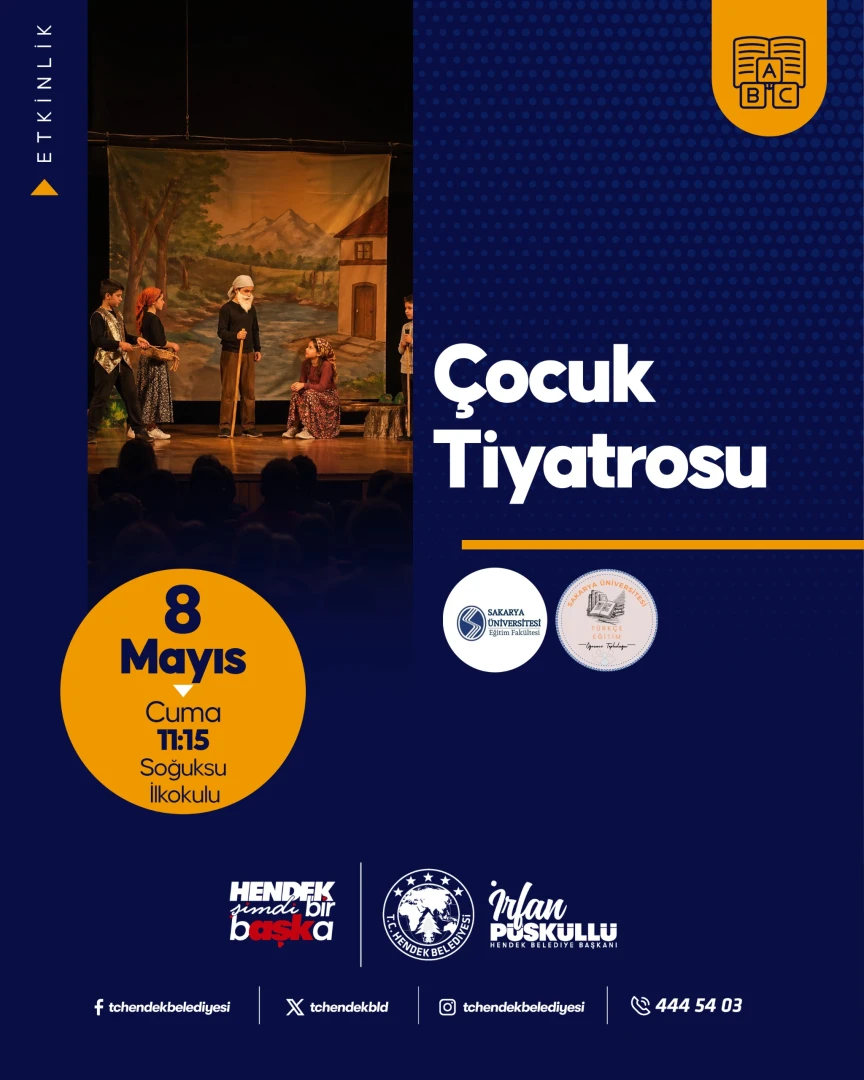 Hendek Belediyesi ile Sakarya Üniversitesi Eğitim Fakültesi Türkçe Eğitim Topluluğu tiyatro ekibi tarafından Soğuksu İlkokulu öğrencilerine yönelik tiyatro etkinliği ile buluşuyoruz.