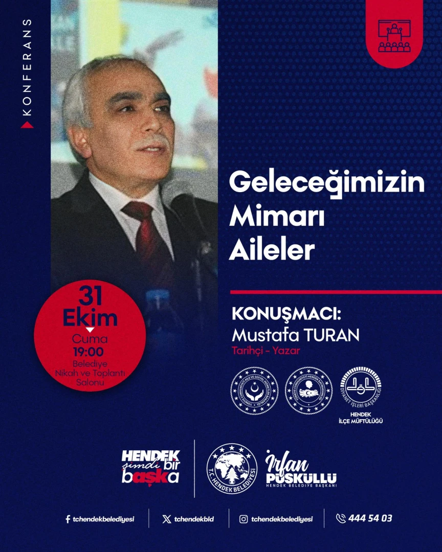 Hendek Belediyesi ve Hendek İlçe Müftülüğü iş birliğiyle ailenin toplumdaki yeri, değerlerimizin geleceğe taşınması ve güçlü bir neslin inşasında aile yapısının önemi üzerine gerçekleşecek olan konferansta, Tarihçi Yazar Mustafa Turan bizlerle olacak.