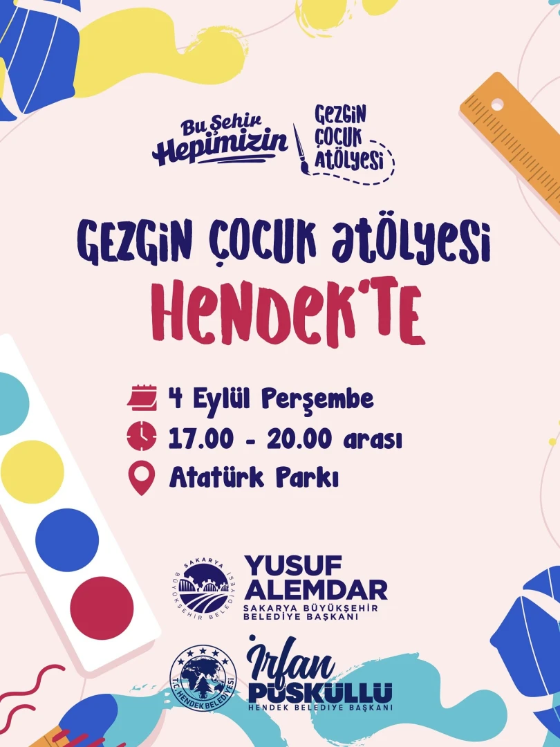 Sakarya Büyükşehir Belediyesi Kültür ve Sosyal İşler Daire Başkanlığı’nın düzenlediği Gezgin Çocuk Atölyesi etkinliği, 4 Eylül Perşembe günü 17:00 – 20:00 saatleri arasında Atatürk Parkı’nda sizlerle buluşuyor!