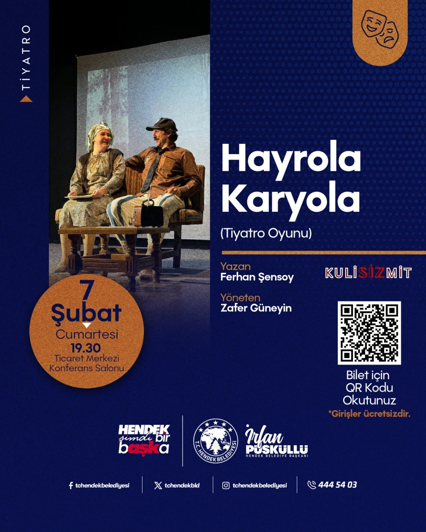 Hendek Belediyesi olarak 2026 yılında sanatsever vatandaşlarımızı Ferhan ŞENSOY'un eşsiz eserlerinden "HAYROLA KARYOLA" adlı oyunla buluşturuyor.