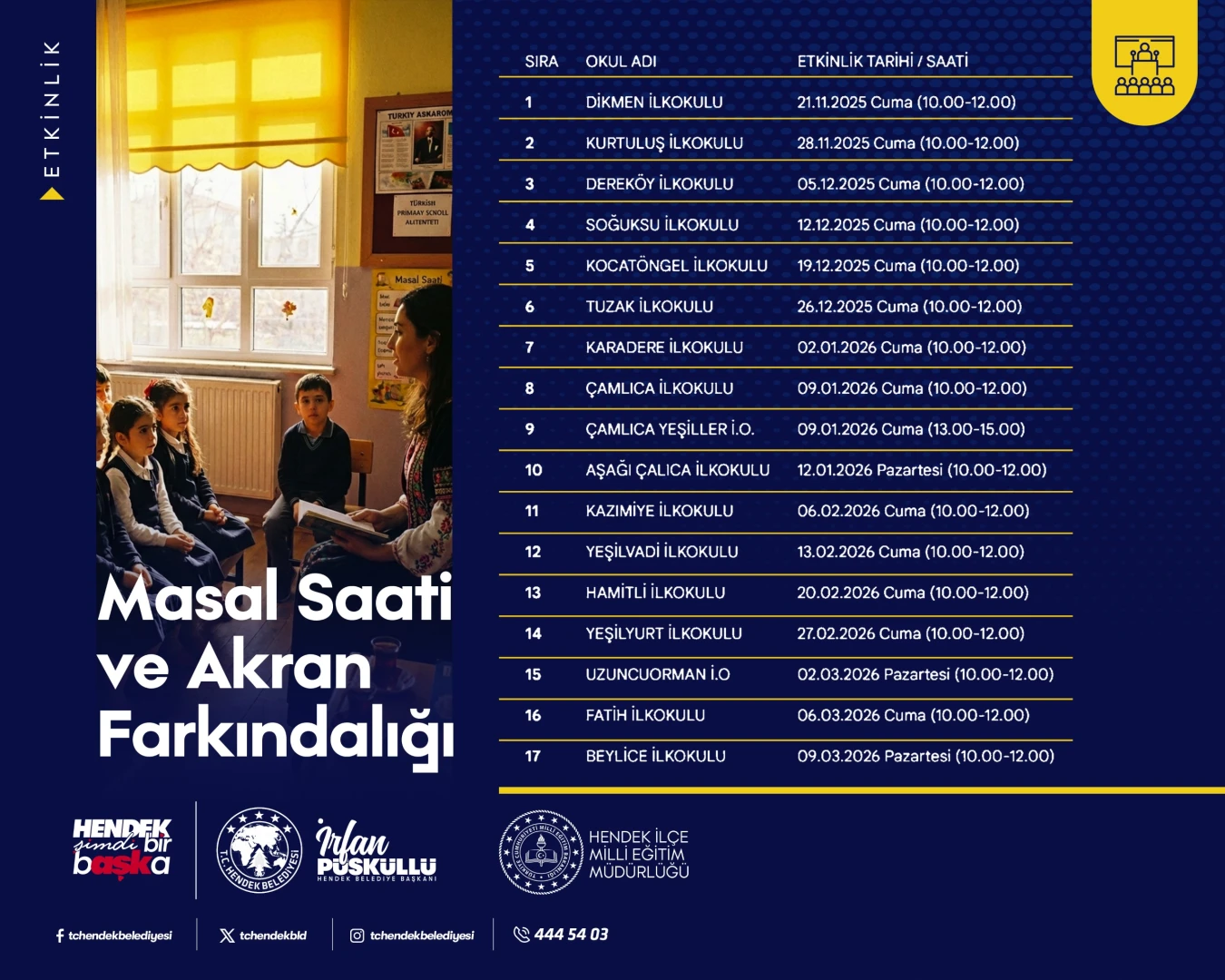 Hendek Belediyesinden konuyla ilgili yapılan açıklamada şu ifadelere yer verildi: “Kültür ve Sosyal İşler Müdürlüğümüz koordinesinde yürütülen ve 17 kırsal mahalle okulunda 15 hafta sürecek ‘Masal Saati ve Akran Nezaketi’ etkinliğimiz, kırsal mahallelerin ardından ilçe merkezindeki ilkokullarımızda da devam edecek. Merkezi okullarımız için etkinlikler Hendek Belediyesi Ticaret Merkezi Konferans Salonu’nda gerçekleştirilecek. Etkinlik takvimi, hem ilgili okullar hem de Belediyemiz tarafından tüm iletişim kanallarımız üzerinden duyurulacaktır. Hendek’te çocukların gelişimine katkı sunan faaliyetlerimiz eğitim-öğretim yılı boyunca sürecektir” denildi.