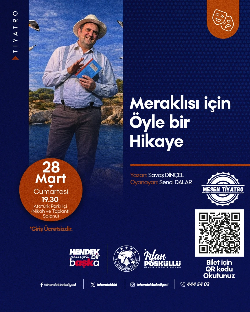 Hendek Belediyesi tarafından 28 Mart 2026 Cumartesi günü 19.30'da Şavaş DİNÇEL'in kaleme aldığı"Meraklısı İçin Öyle Bir Hikaye" konulu tiyatro gösterimi olacaktır.