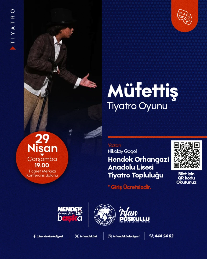 Hendek Orhangazi Anadolu Lisesi Tiyatro Topluluğu tarafından sahnelenecek olan "MÜFETTİŞ" adlı tiyatro oyunu, "ücretsiz sahnelecek olup yerinizi ayırtmayı unutmayınız."