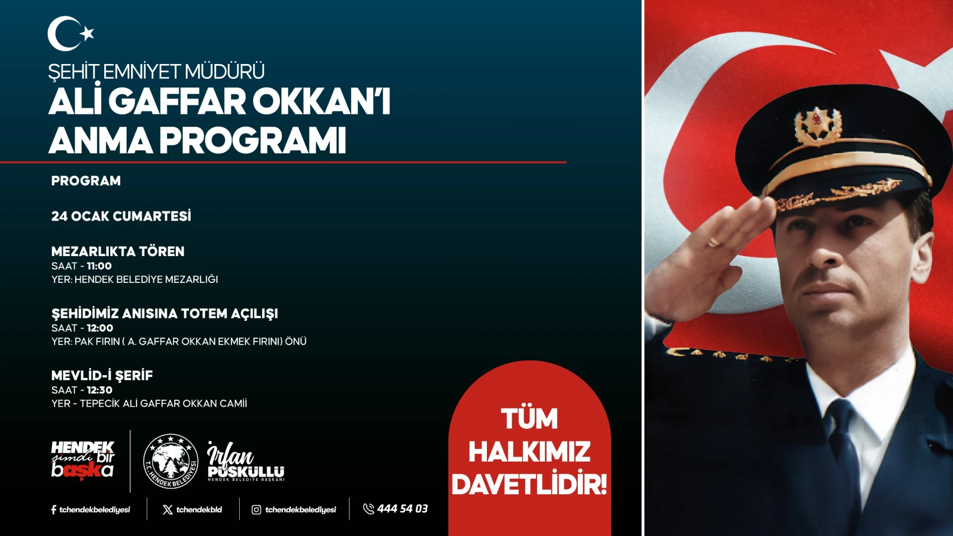 Diyarbakır Emniyet Müdürüyken 2001 yılında uğradığı hain saldırı sonucu 5 polis memuruyla birlikte şehit edilen Ali Gaffar Okkan, Hendek Kaymakamlığı öncülüğünde; Hendek Belediyesi ve Hendek İlçe Emniyet Müdürlüğü tarafından organize edilen program kapsamında İl ve İlçe Protokolünün katılımıyla 24 Ocak 2026 Cumartesi günü saat 11.00’da Hendek’te kabri başında dualarla anılacak.