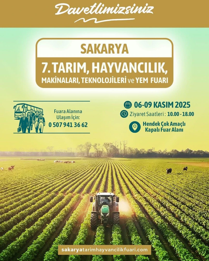 Sakarya 7. Tarım ve Hayvancılık Makinaları, Teknolojileri ve Yem Fuarı Yarın Hendek Ticaret Merkezi Kapalı Pazar Yeri Çok Amaçlı Fuar Alanında kapılarını açıyor.