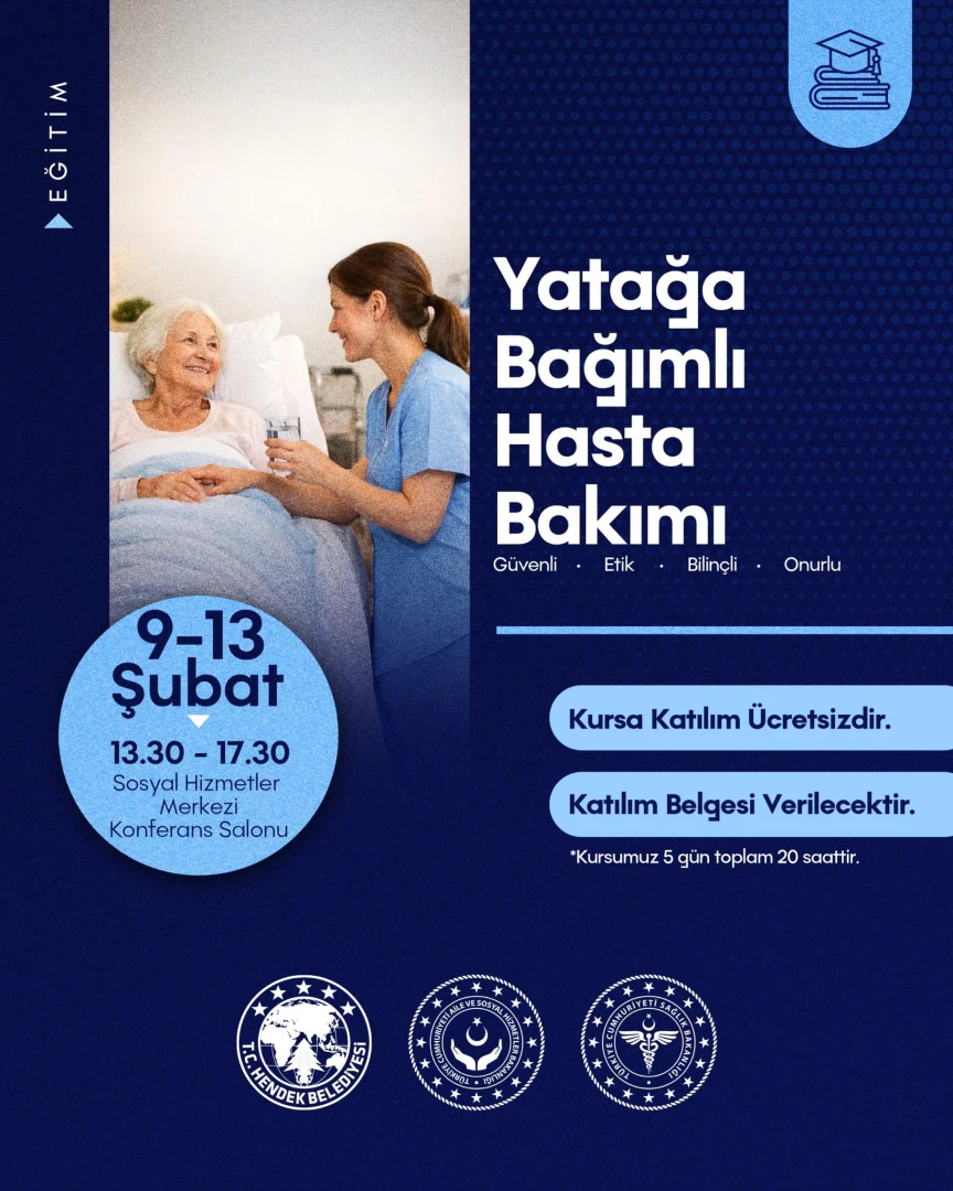 9–13 Şubat 2026 tarihleri arasında Hendek İlçe Sağlık Müdürlüğü tarafından, Hendek Belediyesi ve Hendek Sosyal Hizmetler Merkezi Müdürlüğü iş birliğiyle Yatağa Bağımlı Hasta Bakımı ve Evde Hasta Bakıcı Eğitimi düzenleniyor.