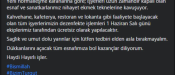 Açıklamanın ardından esnaf işyerini bugüne hazırlarken, Hendek Belediye Başkanı Turgut Babaoğlu’da dün akşam sosyal medya hesabından bir paylaşım yaptı. Başkan Babaoğlu, “Yeni normalleşme kararlarına göre; işyerleri uzun zamandır kapalı olan esnaf ve sanatkarlarımız nihayet ekmek teknelerine kavuşuyor. Kahvehane, kafeterya, restoran ve lokanta gibi faaliyete başlayacak olan tüm işyerlerimizin dezenfekte işlemleri 1 Haziran Salı günü ekiplerimiz tarafından ücretsiz olarak yapılacaktır. Sağlık ve umut dolu yarınlar için lütfen tedbiri elden asla bırakmayalım. Dükkanlarını açacak tüm esnafımıza bol kazançlar diliyorum. Haydi Hayırlı işler” diye yazdı.
