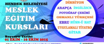 Hendek Belediyesi’nin başlattığı Meslek Eğitim Kurslarında ücretsiz olarak bağlama, gitar, ebru, diksiyon, bilgisayar,  tiyatro, Arapça, Osmanlı Türkçesi, İngilizce, hat, ve fotoğrafçılık kursları yer alıyor. 1-16 Ekim tarihleri arasında devam edecek olan başvuru süresince Meslek Eğitim Kurslarına katılmak isteyenlerin, Nüfus Cüzdanı fotokopisi ve Başvuru formu doldurmaları yeterli.